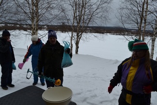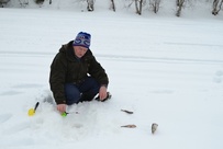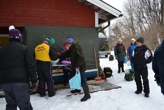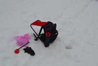 Kisa sujui muuten mukavasti eikä ilmakaan kovin paha ollut, mutta juuri kun saimme palkintojenjaon käyntiin, alkoi armoton märkä lumipyry aikamoisen tuulen kera.. Saimme kuitenkin kisan melkein loppuun asti kastumatta ja pääsimme kuitenkin pahimman pyryn alta pois. Nautimme vielä loput kahvit pullineen ja makkarat ja jätimme Kaarinalle saamamme kalasaaliin kiitokseksi "rannan lainasta" jälleen!
