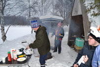 Ennen kisan alkua ja jäälle lähtöä joimme nokipannukahvit pullineen ja täytimme vatsat paistetuilla makkaroilla jaksaaksemme kisata kunnolla.