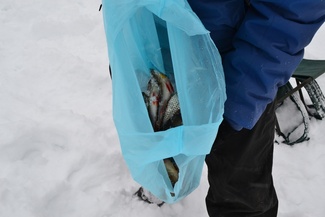 Pienessä lumisateessa parin tunnin kisa sujui kuitenkin ihan leppoisasti, mutta tällä kertaa Ahti ei oikein suonut antejaan. Kisan kokonaissaalis oli vain 4543 g, kun taas viimevuotinen yhteismäärä oli tuplasti parempi eli 9605 g! Kaikilla ei ollut edes nykyn nykyä pilkeissä, mutta olihan se silti mukavaa ajanvietettä ja saimme raitista ilmaa kuitenkin! Palkintojenjako sujui sutjakkaasti ja lumipyrykin alkoi laantua. Lopuksi keittelimme vielä uudet nokipannukahvit rupattelujen lomassa ja näin saimme jälleen yhden kisan lisää muistojemme kirjoihin!